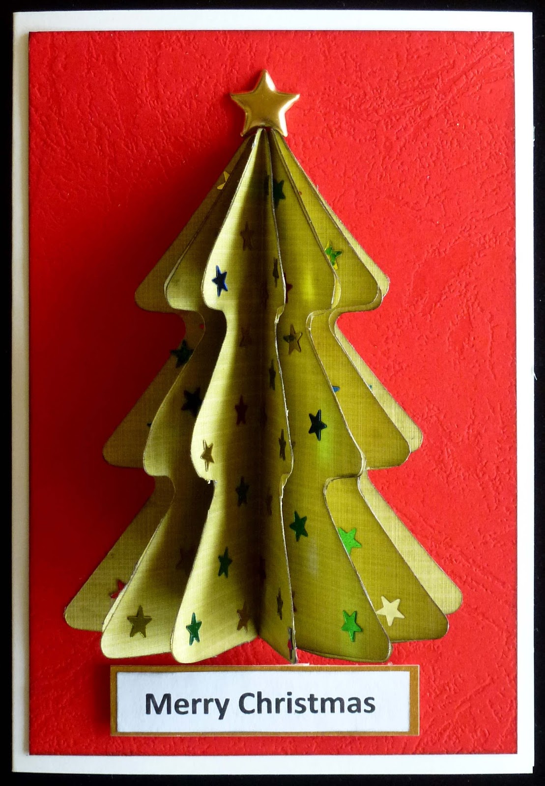 You need a symmetric shape for this technique, mine was not quite symmetric but I got away with it. I used a cut file on my Scan N Cut to cut 6 trees but you could die cut the shape you want to use. Fold each one in half then stick them back to back to create the fan effect. I have then glued tiny glitter stars onto the tree before I attached it to the card panel. Add the star brad at the top of the tree and the greeting at the bottom of the panel then attach that with foam tape to the card base.